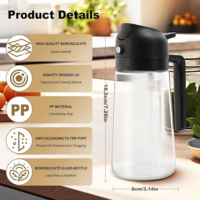 Design 2 in 1 Versatile - Dispenser e spruzzatore di olio in un unico dispositivo, ideale per controllare l'assunzione di grassi e oli. Facilita il dosaggio dell'olio per condire, grigliare, cuocere e altre preparazioni alimentari